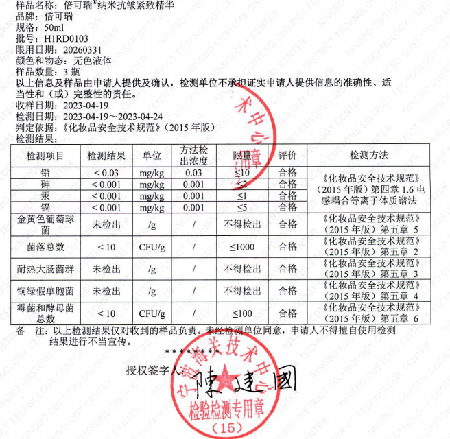 倍可瑞®納米抗皺緊致精華是國家藥品監(jiān)督管理局審核全項目合格備案通過的產(chǎn)品,經(jīng)過專業(yè)的機構(gòu)檢測,無激素、無任何重金屬和菌落超標(biāo),在產(chǎn)品安全性上,消費者可以放心購買使用。