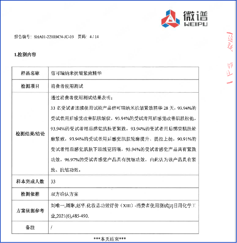 通過權(quán)威機構(gòu)的人體試驗,產(chǎn)品消費者使用測試結(jié)果表明:33名受試者連續(xù)使用試驗產(chǎn)品倍可瑞納米抗皺緊致精華28天,93.94%的受試者用后感覺肌膚更緊致,93.94%的受試者用后感覺肌膚輪廓緊致,93.94%的受試者用后感覺肌膚輪廓提升、提拉上揚,90.91%的受試者用后感覺肌膚下頜線更清晰,93.94%的受試者感覺產(chǎn)品具有緊致功效,96.97%的受試者感覺產(chǎn)品具有抗皺功效。