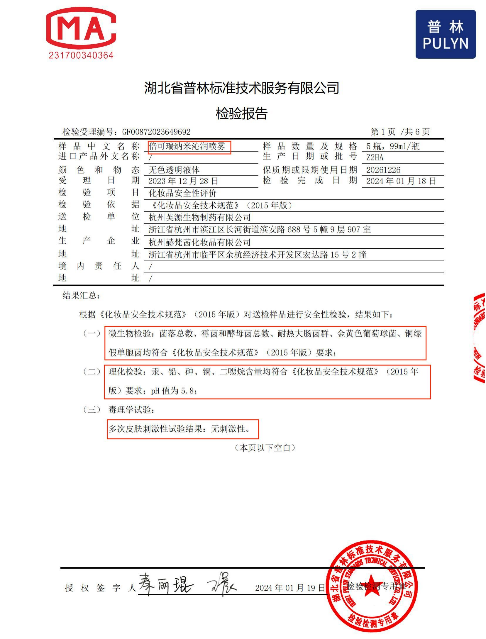 本次推出的新品——納米沁潤(rùn)噴霧,通過(guò)嚴(yán)格的國(guó)家資質(zhì)審核和備案,已經(jīng)過(guò)權(quán)威機(jī)構(gòu)的一系列檢測(cè)驗(yàn)證,擁有全面、完善的檢測(cè)報(bào)告。