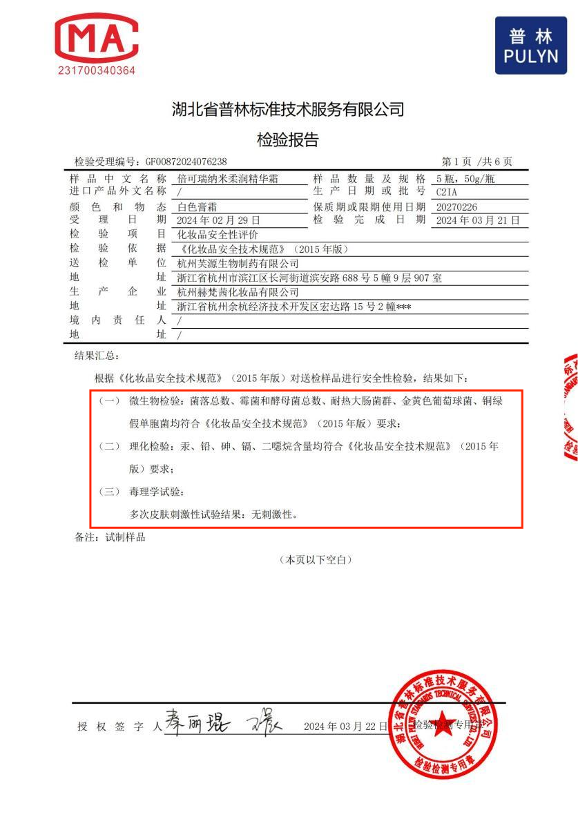 納米柔潤精華霜產(chǎn)品檢驗報告