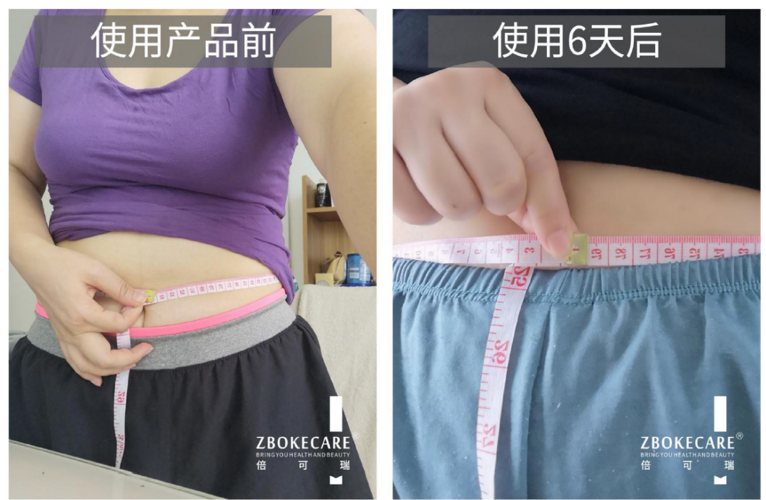 使用后:使用產品6天后,腹部皮膚變緊實、收緊,腰圍測量79公分,塑形5公分。