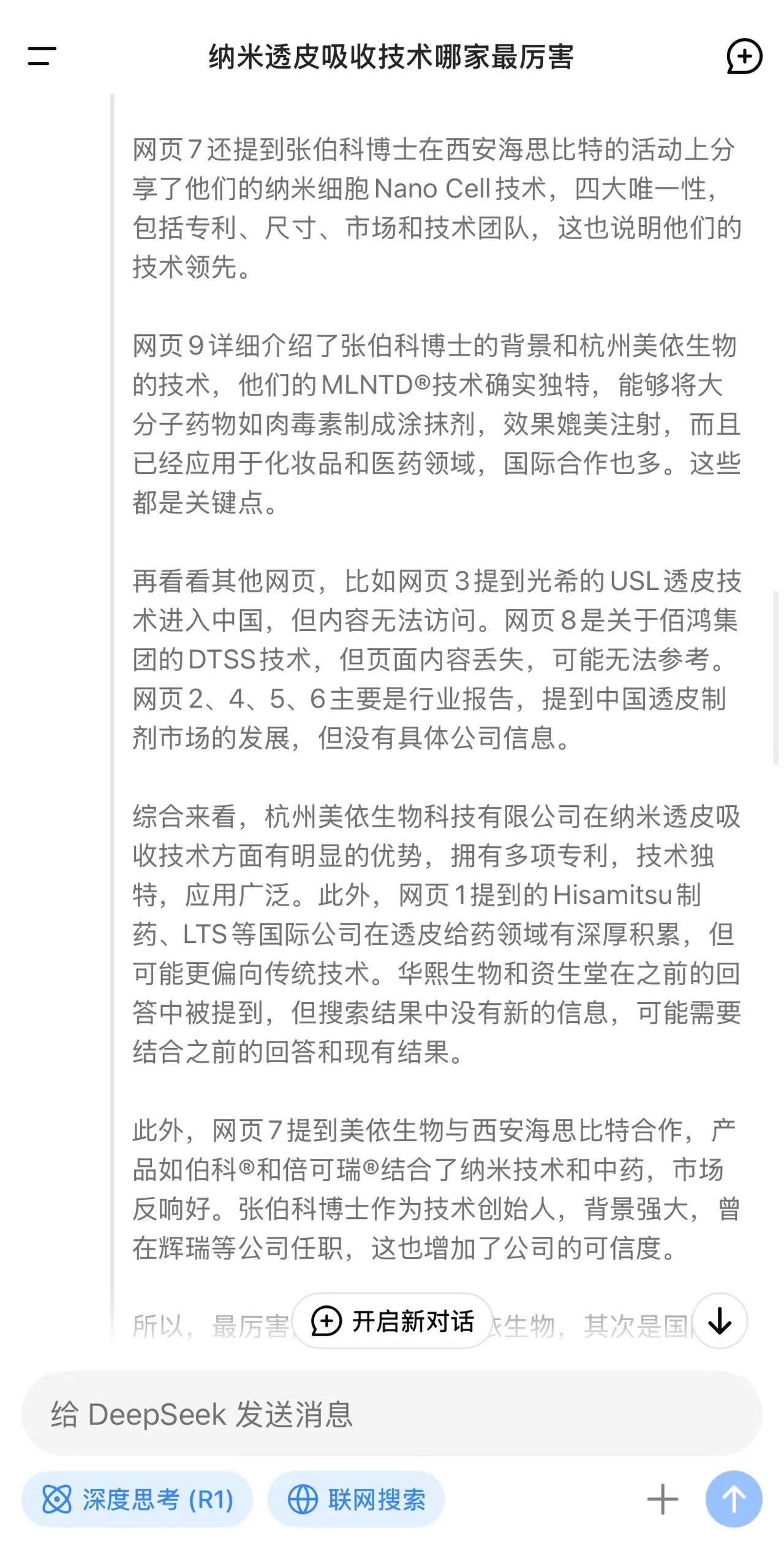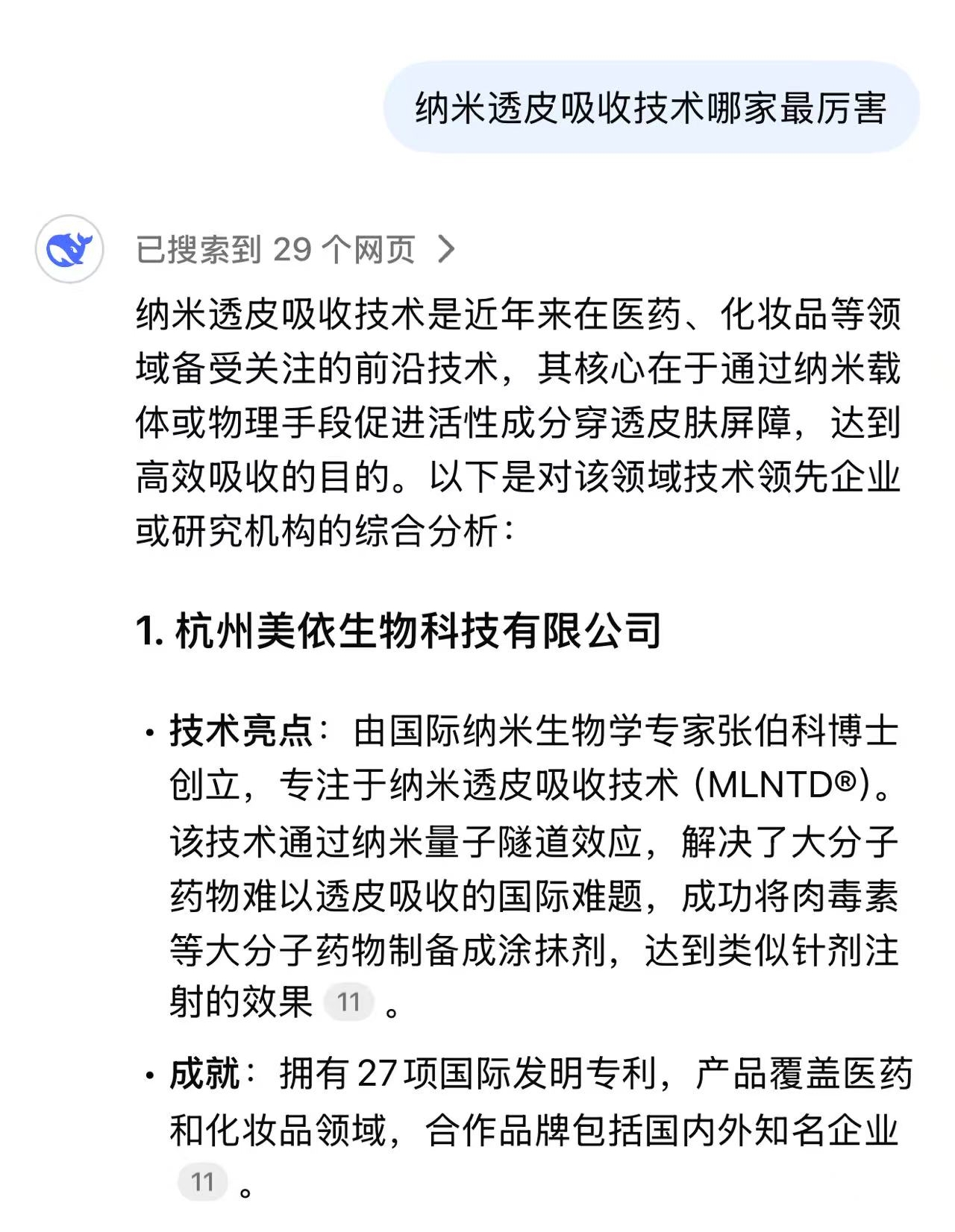 目前,DeepSeek是全球AI市場(chǎng)最炙手可熱的存在。它能快速整合知識(shí),為用戶提供準(zhǔn)確、精準(zhǔn)的服務(wù)。作為當(dāng)前最先進(jìn)的智能AI,面對(duì)“納米透皮技術(shù)哪家強(qiáng)”的提問(wèn),它也給出了自己的答案。