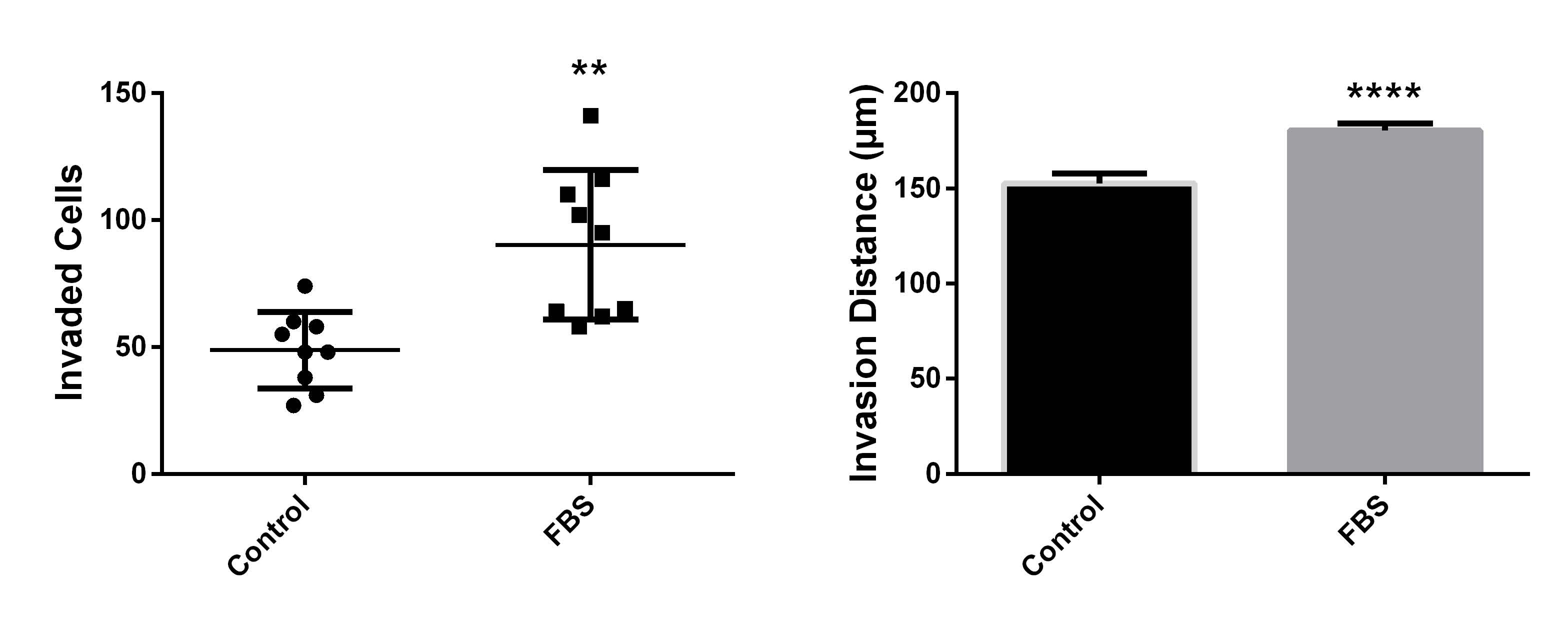 注:入侵細胞的數(shù)量可以很簡便地通過計算選定區(qū)域的核數(shù)來確定。細胞遷移速度可以通過確定細胞在給定時間的遷移距離進而很容易地被量化。