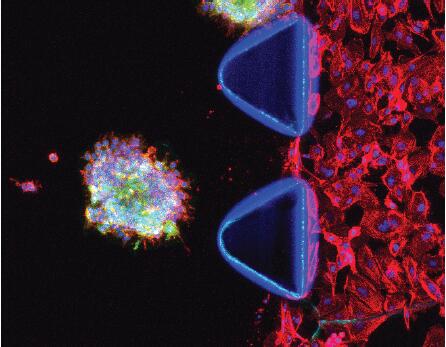 (1)播散:癌細胞球體分布情況監(jiān)測用于建立發(fā)生在癌癥早期階段的轉(zhuǎn)移模型(EMT)。癌細胞球體可以被植入AIM芯片的3D水凝膠網(wǎng)絡(luò)中,而且可以和其他細胞(如內(nèi)皮細胞)共培養(yǎng)以便于更準(zhǔn)確地模擬腫瘤微環(huán)境。